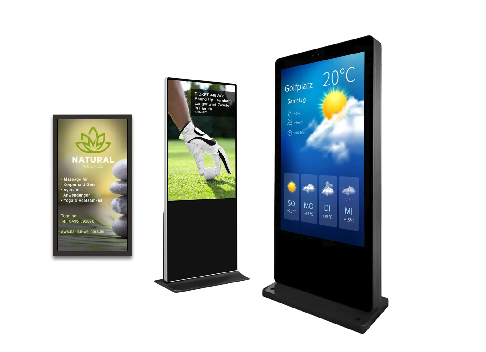 Wir bieten Lösungen mit hochauflösenden, besonders hellen Displays, flexiblen Design- und Platzierungsmöglichkeiten für Innen- und Außenbereiche, zuverlässigem 24/7-Dauerbetrieb und einer benutzerfreundlichen Content-Verwaltung.